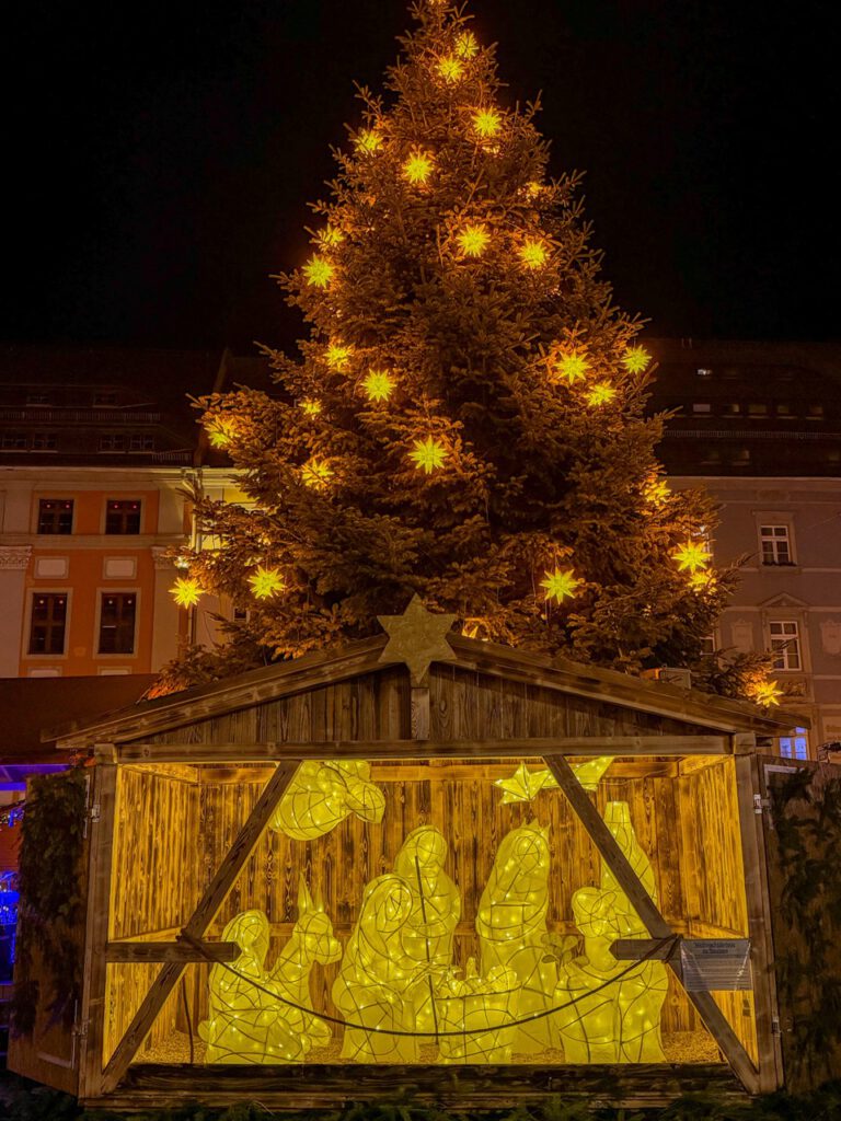 クリスマスマーケットの中心にある素敵なクリスマスツリーの下にはクリッペ(キリスト降誕を表現)。