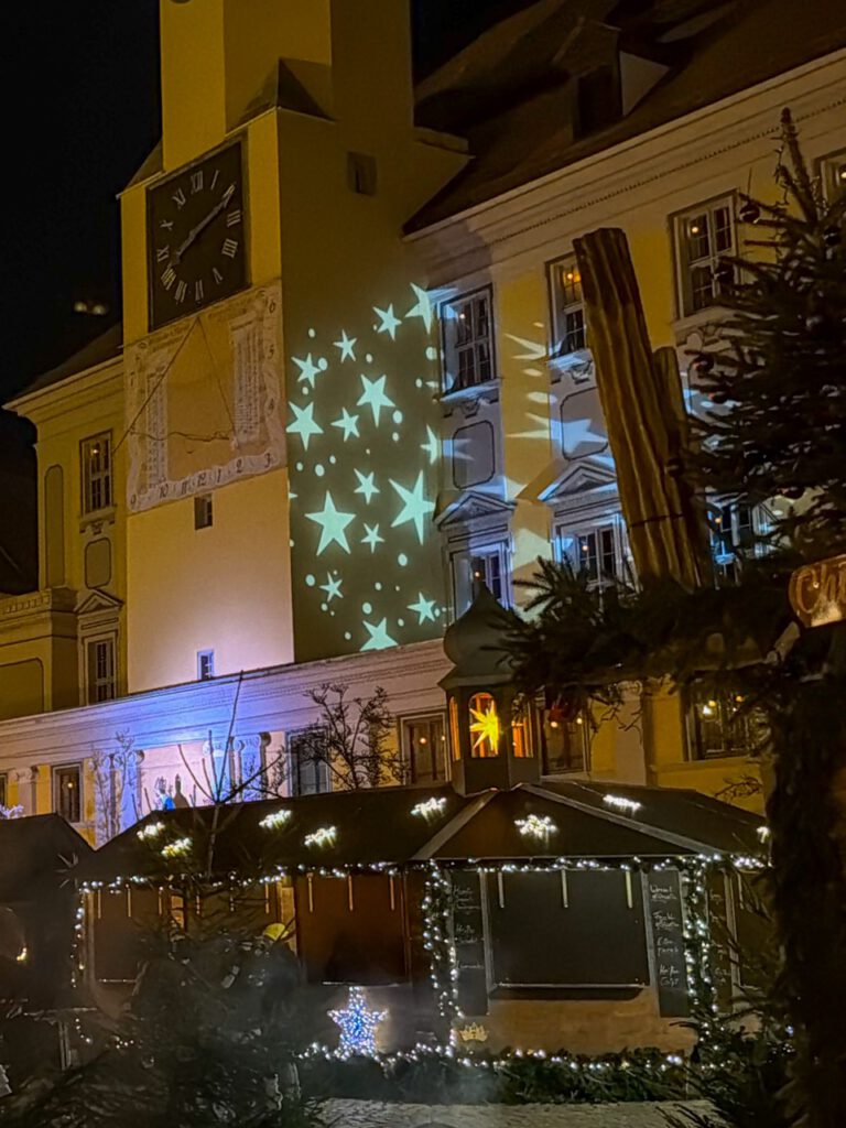 黄色く塗られた市庁舎の壁に投影される夜のプロジェクトマッピングも素敵だった。